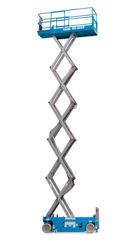 The Genie GS-3232 E-Drive slab scissor lift is an electric model ideal for operation in emission and sound-sensitive indoor and outdoor jobsites where space is limited.